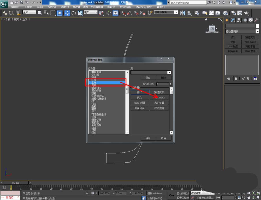 3、點擊【修改】-【配置修改器集】,彈出配置修改器集設置欄,找到【車削】并將其拉動到右邊選項框中,點擊【確定】將車削功能調出;