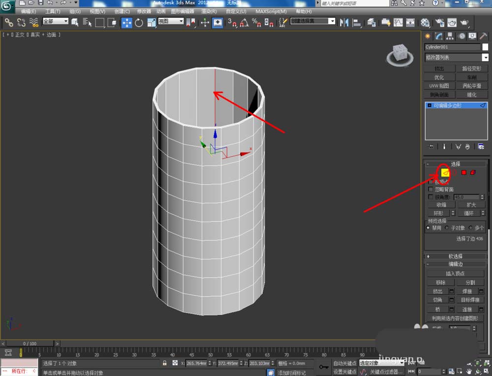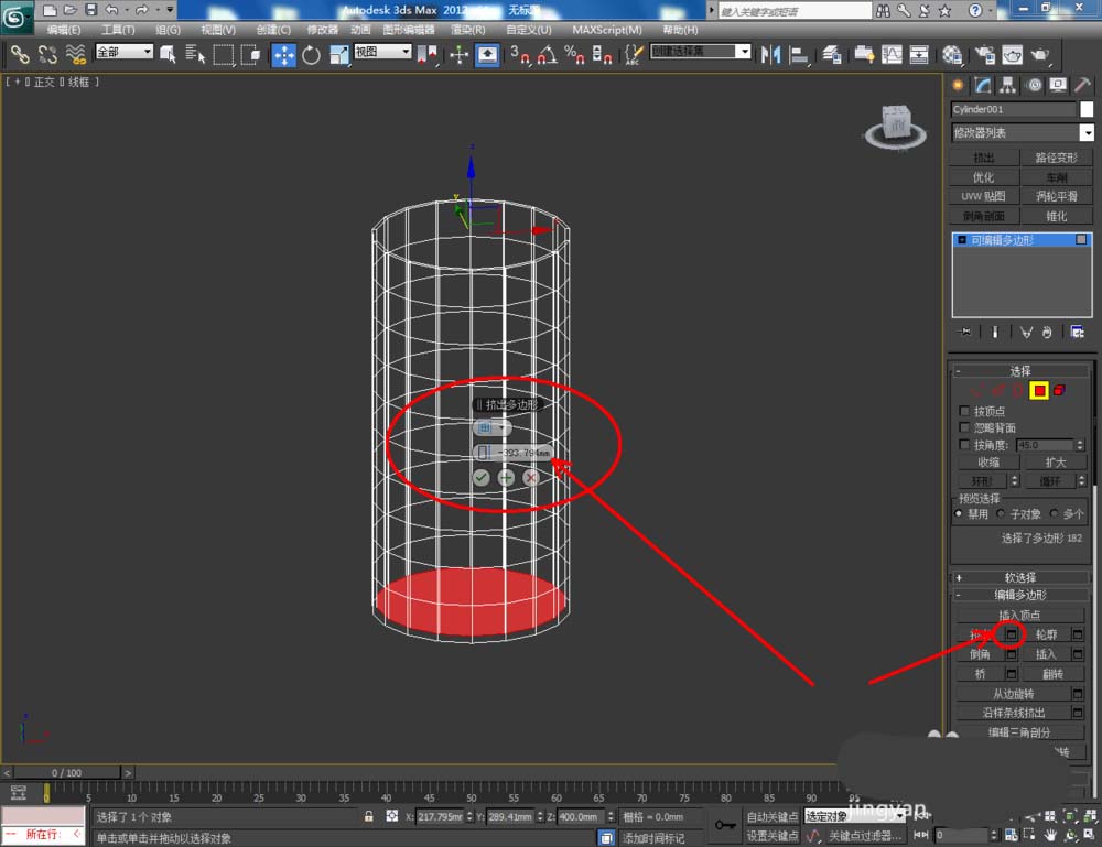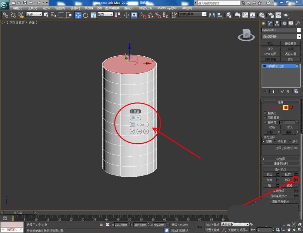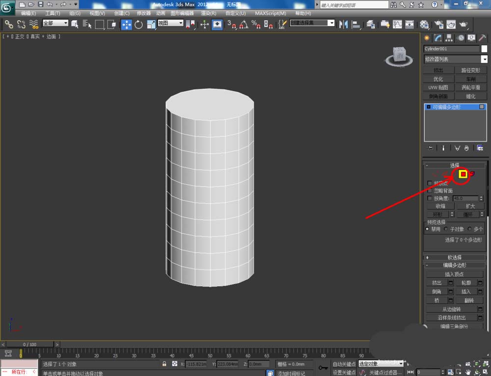 1、打開3Dmax2012軟件,點擊【創建】-【幾何體】-【圓柱體】,在作圖區域繪制一個圓柱體模型并按圖示設置好圓柱體的各個參數。選中模型,點擊【對象顏色】將模型的對象顏色設置為:白色后,點擊鼠標右鍵-【轉換為】-【轉換為多邊形】;