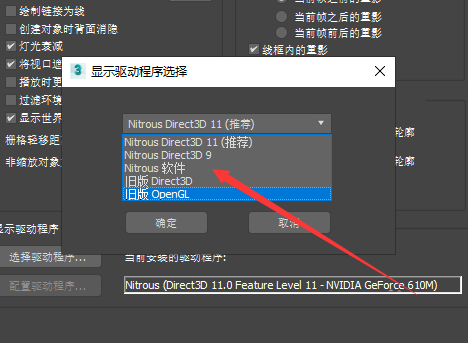 6、然后彈出顯示驅動程序選擇對話框中單擊"下拉按鈕"選擇需要的顯卡驅動程序,一般默認的配置顯卡的推薦驅動,還有其他的選項卡在這不一一設置,根據自己的操作而設置。
