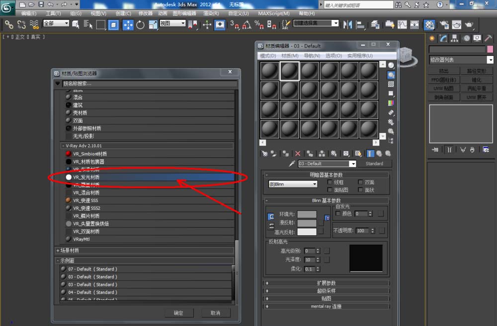 3、點擊【材質編輯器】,彈出材質編輯器設置框,點擊【standard】-【VR-發光材質】設置一個發光材質球(如圖所示);