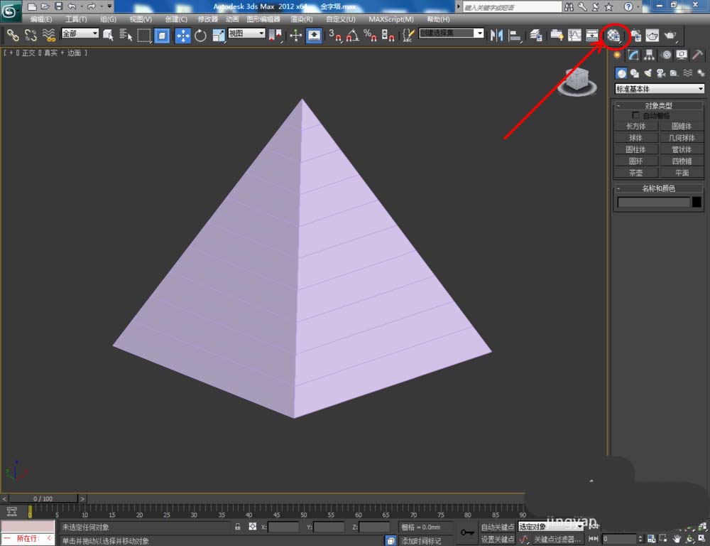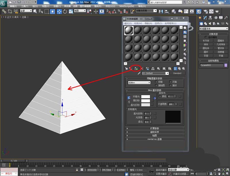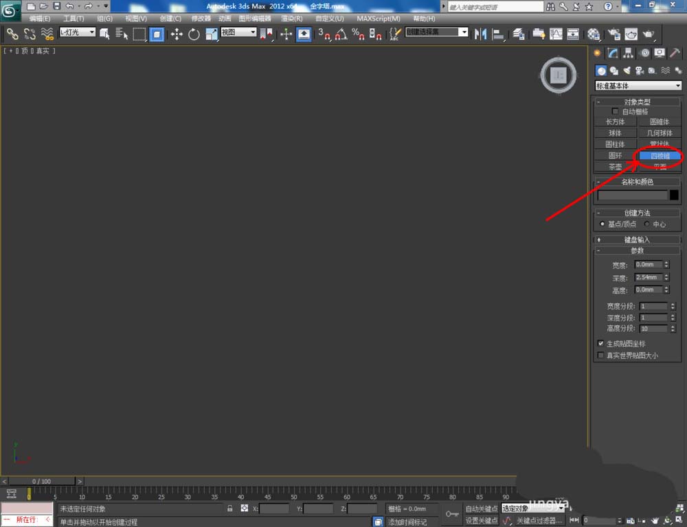 1、打開3Dmax2012軟件,點擊【創建】-【幾何體】-【標準基本體】-【四棱錐】,在作圖區域繪制一個四棱錐模型并按圖示設置好模型的各個參數;