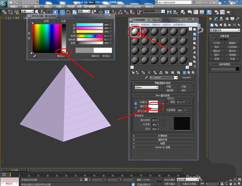 2、點擊【材質編輯器】,彈出材質編輯器設置欄,按圖示設置一個白色材質球并附加給模型。選中模型,點擊【對象顏色】將模型的對象顏色設置為:黑色。點擊鼠標右鍵-【轉化為】-【轉化為可編輯多邊形】;