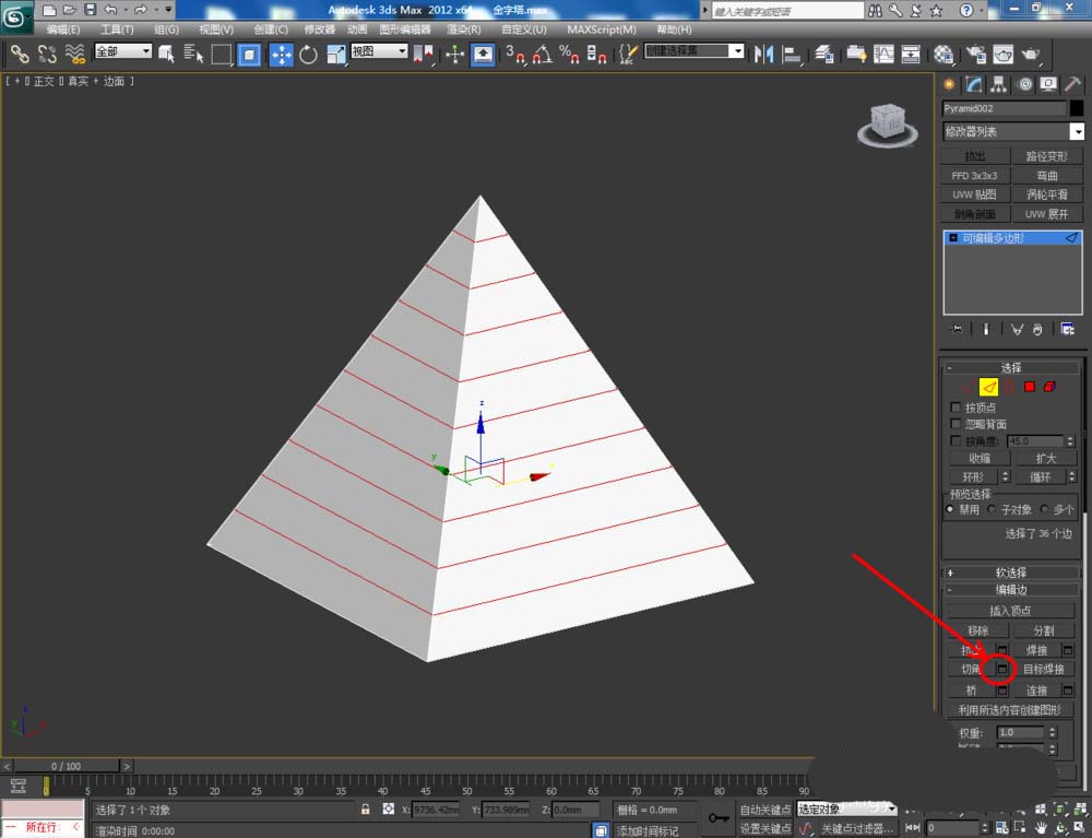 3、點擊右邊工作區中的【邊】圖標,選中圖示模型上的邊后,點擊【切角】右邊的小方框,并按圖示設置好切角的各個參數(如圖所示);