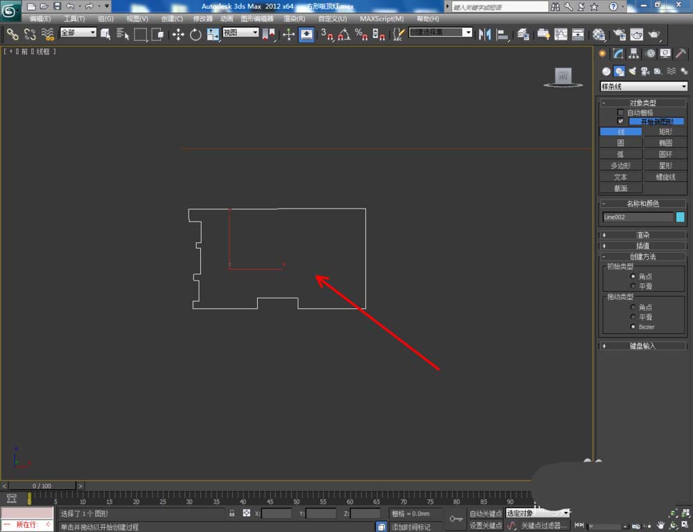 2、點(diǎn)擊【創(chuàng)建】-【圖形】-【線】,在作圖區(qū)域繪制一個(gè)線段圖案。點(diǎn)擊右邊工作區(qū)中的【頂點(diǎn)】圖標(biāo),選中圖案上的點(diǎn)并進(jìn)行移動(dòng)調(diào)整。完成吸頂燈外殼截面圖案的制作,并將【對(duì)象顏色】同樣設(shè)置為:白色;