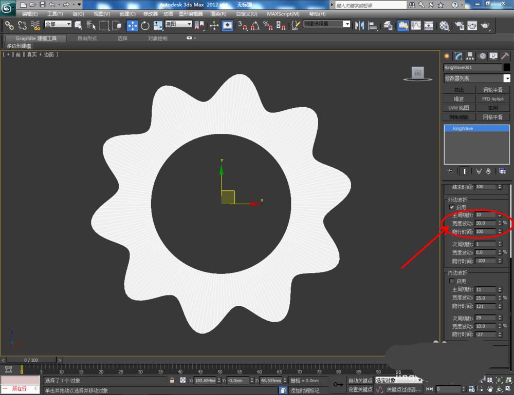 3、選中模型,找到右邊工作區中的內邊波折,將【啟用】前面的勾去除。找到外邊波折,勾選【啟用】,并將【主周期】設置為:10,寬度波動設置為:30(如圖所示);