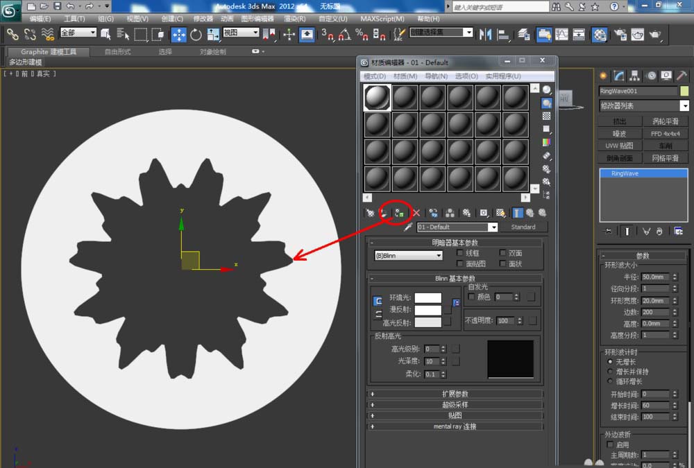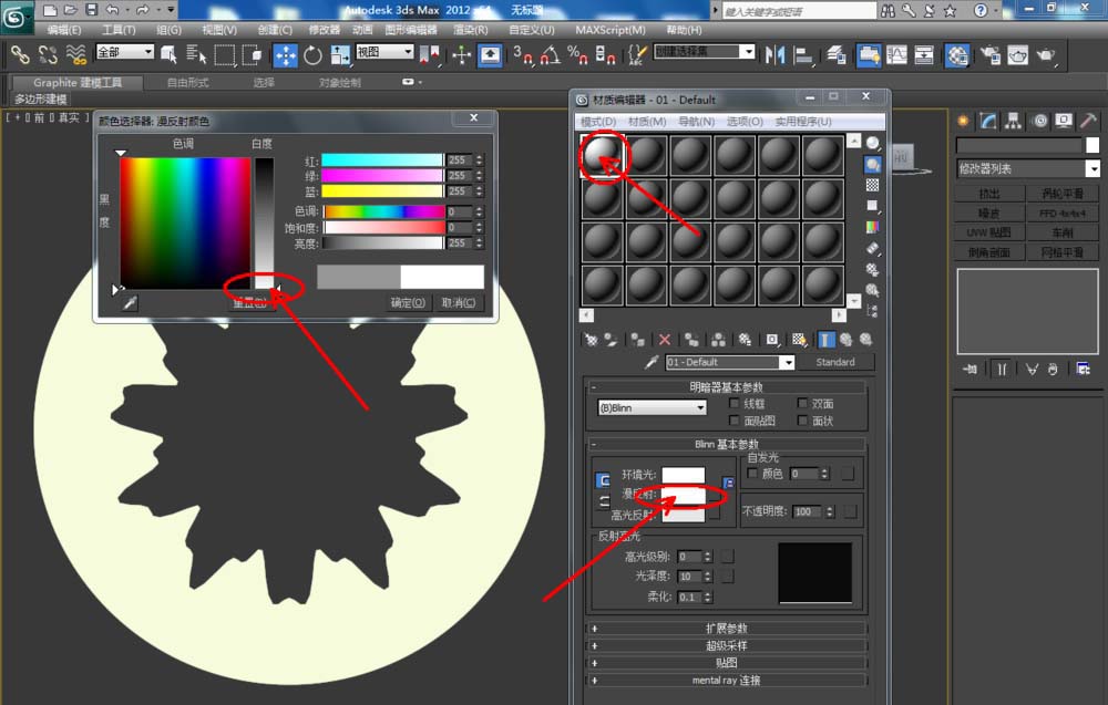 2、點擊【材質編輯器】,彈出材質編輯器設置欄,按圖示設置一個白色材質球并附加給模型。選中模型,點擊【對象顏色】,將模型的對象顏色設置為:黑色;