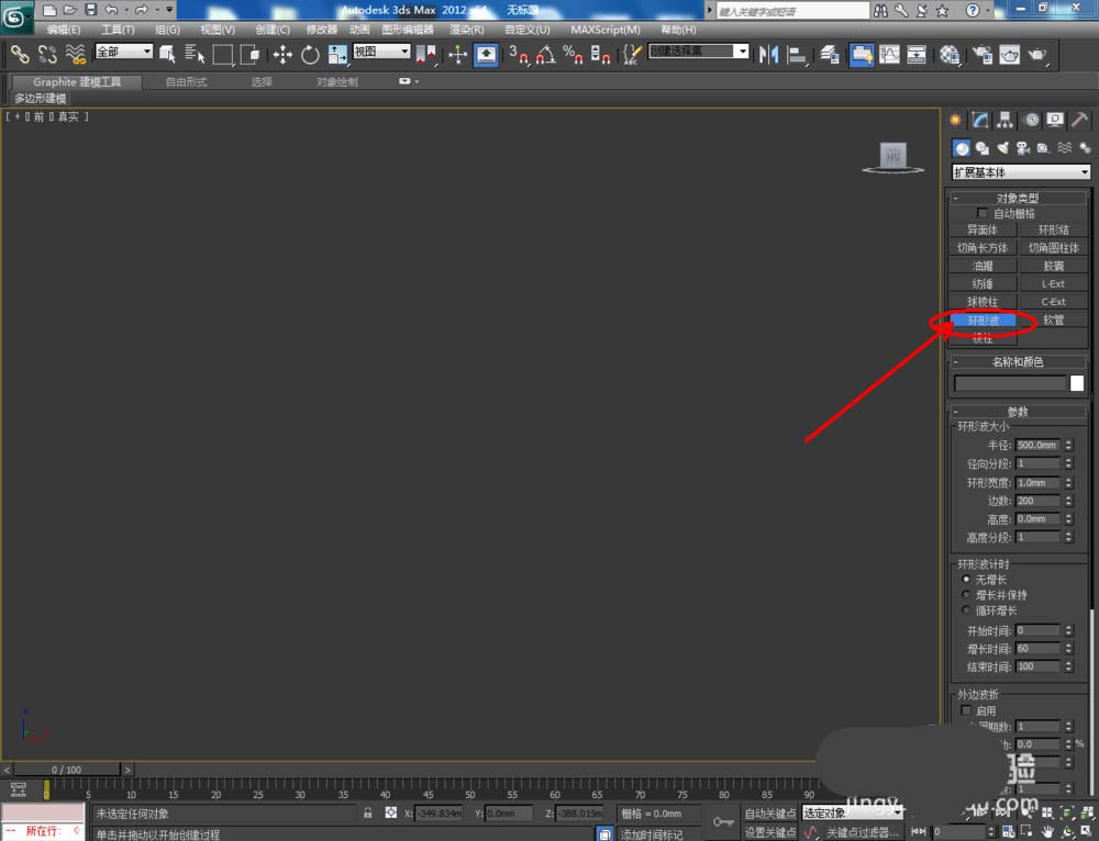 1、打開3Dmax2012軟件,點擊【創建】-【幾何體】-【擴展基本體】-【環形結】,在作圖區域繪制一個環形結模型。點擊【修改】,將環形結的半徑設置為:50mm;環形寬度設置為:20mm;高度設置為:20mm;