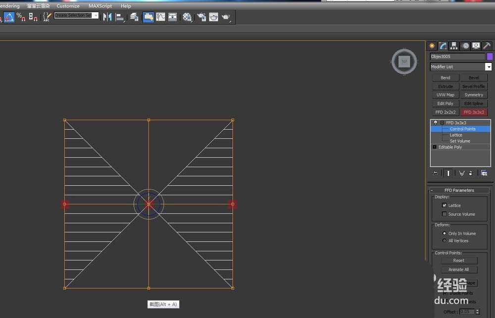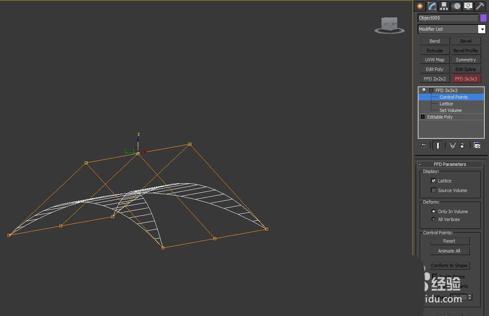 5、切面完成后在修改面板里選擇FFD3x3x3按鈕,框選其中的3個點向上拉,這樣這一半的形狀已經(jīng)出來了。如下: