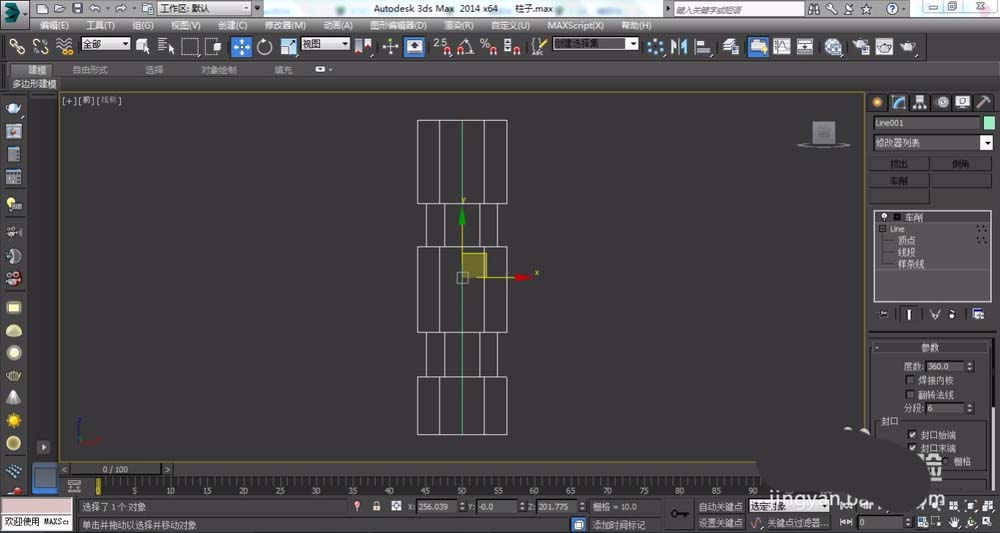 4、截面造型調(diào)節(jié)好之后,選擇所有的點轉(zhuǎn)變?yōu)榻屈c,再使用車削修改器命令對截面進(jìn)行車削,此時會得到一個圓柱的造型。