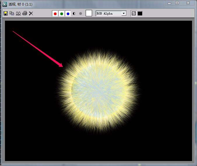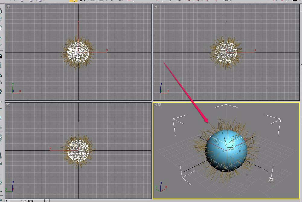 4、此時,可以看到,在球體表面生成了許多毛發。視圖中的毛發顯得比較少,那是軟件為了減輕計算機負擔,只顯示了部分毛發。