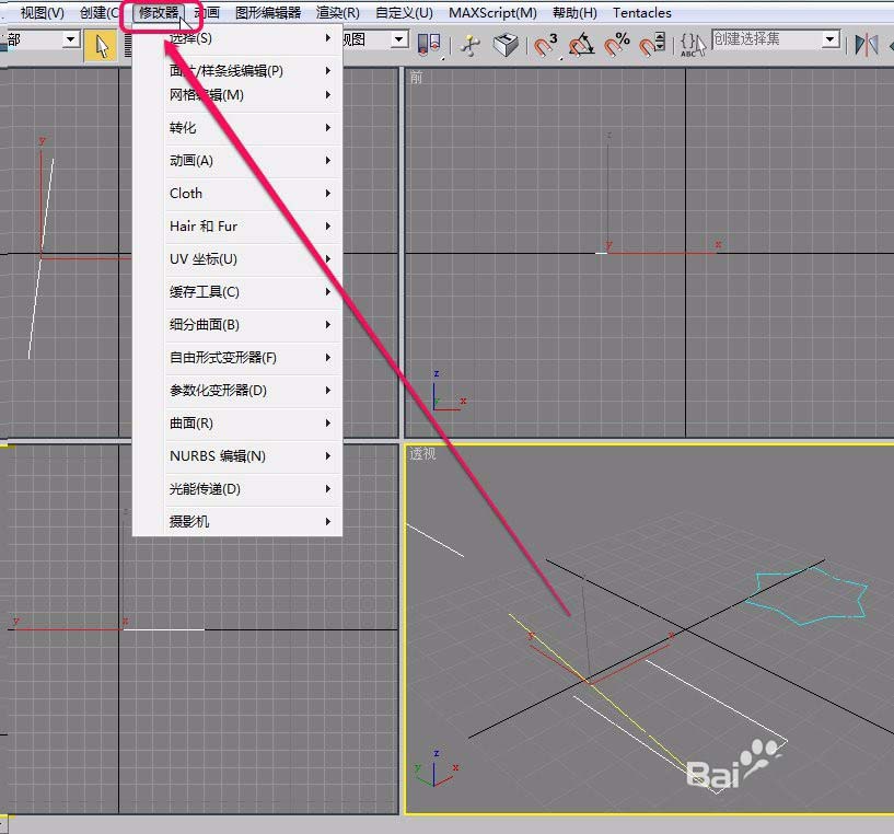 1、打開3ds max軟件,在視圖中創建若干平面圖形。1條直線,1個多邊形。