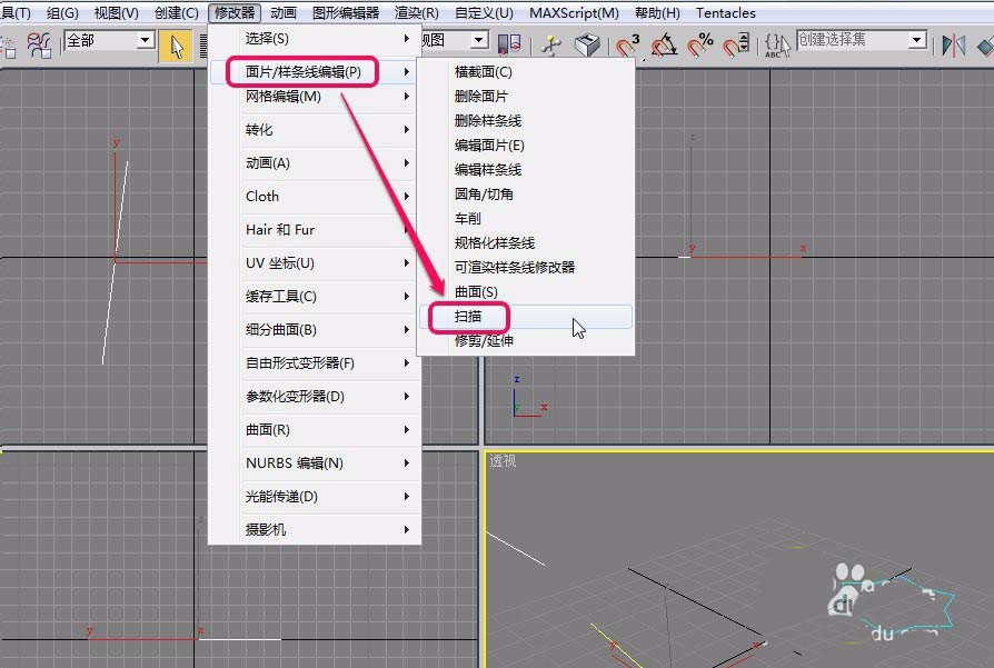 3、選擇“面片/樣條線編輯”中的“掃描”命令。