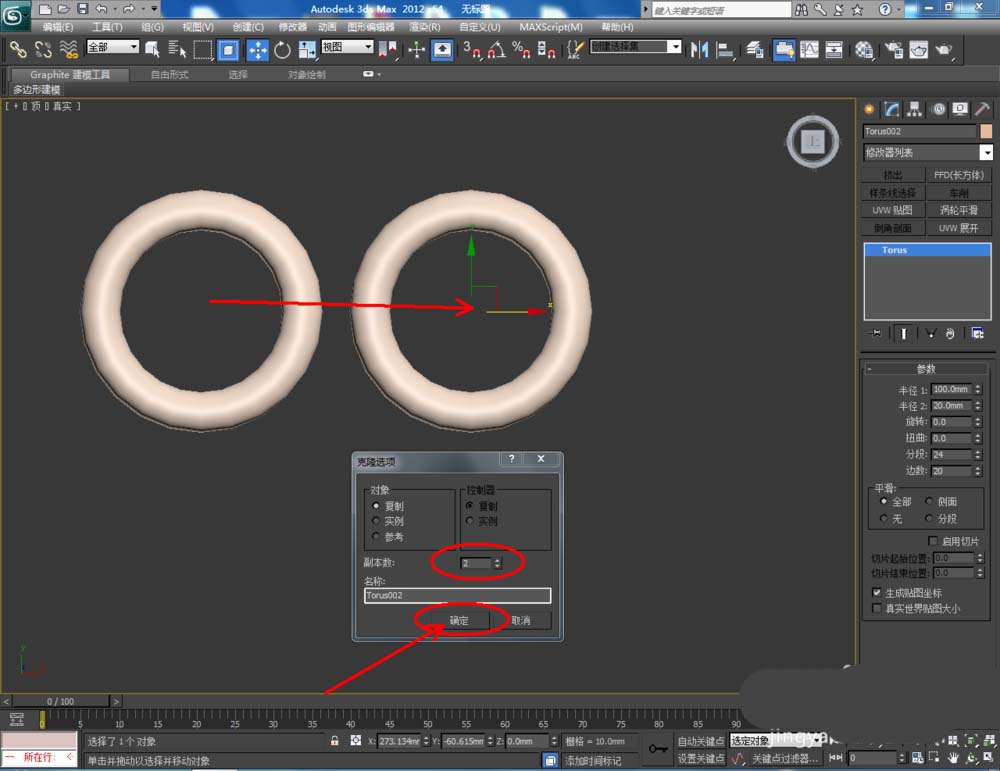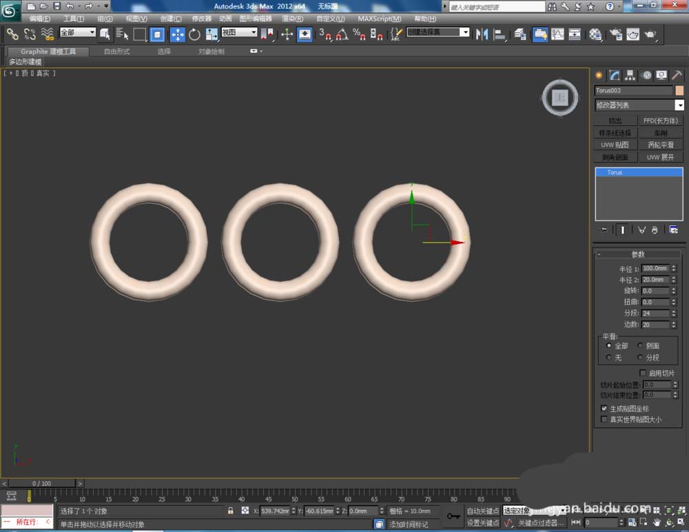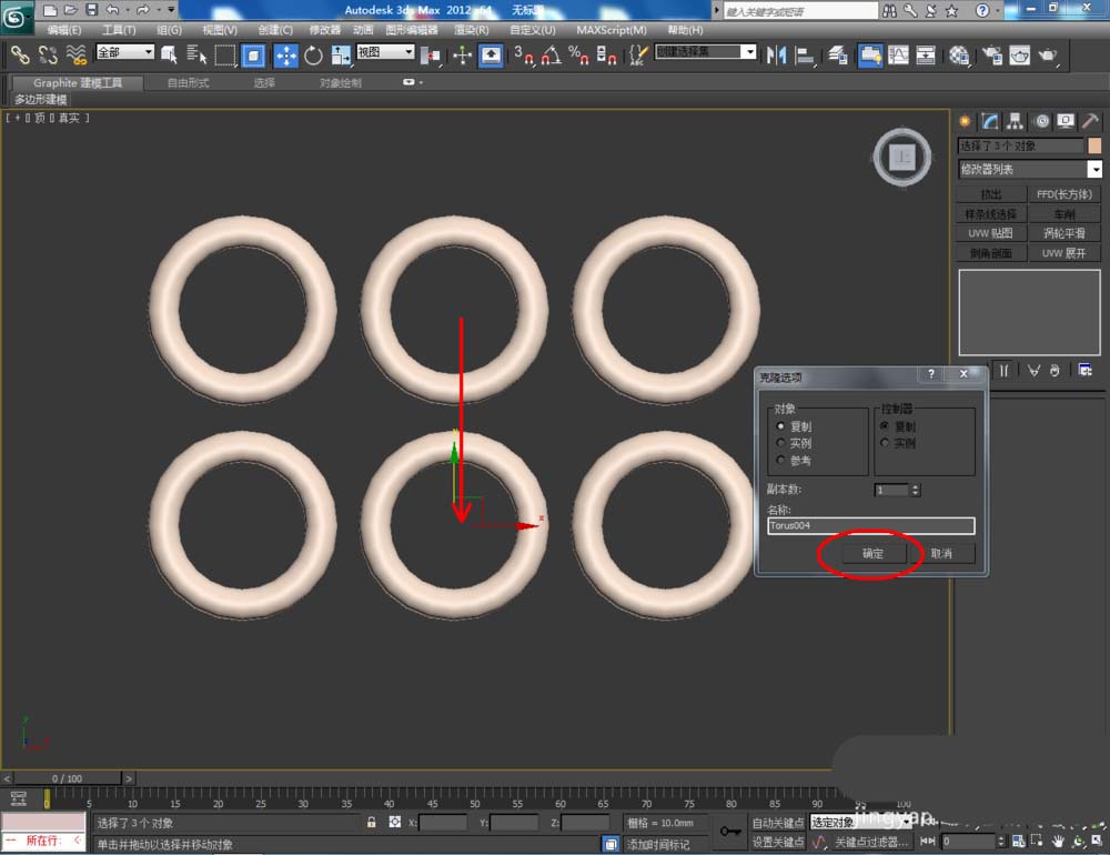 2、選中圓環模型,按住鍵盤【shift】鍵進行拉動復制2個圓環。完成后,選中2個圓環模型再次進行拉動復制(如圖所示);