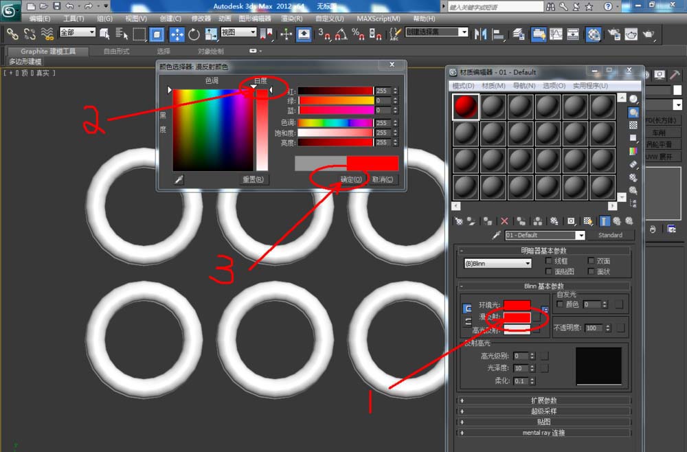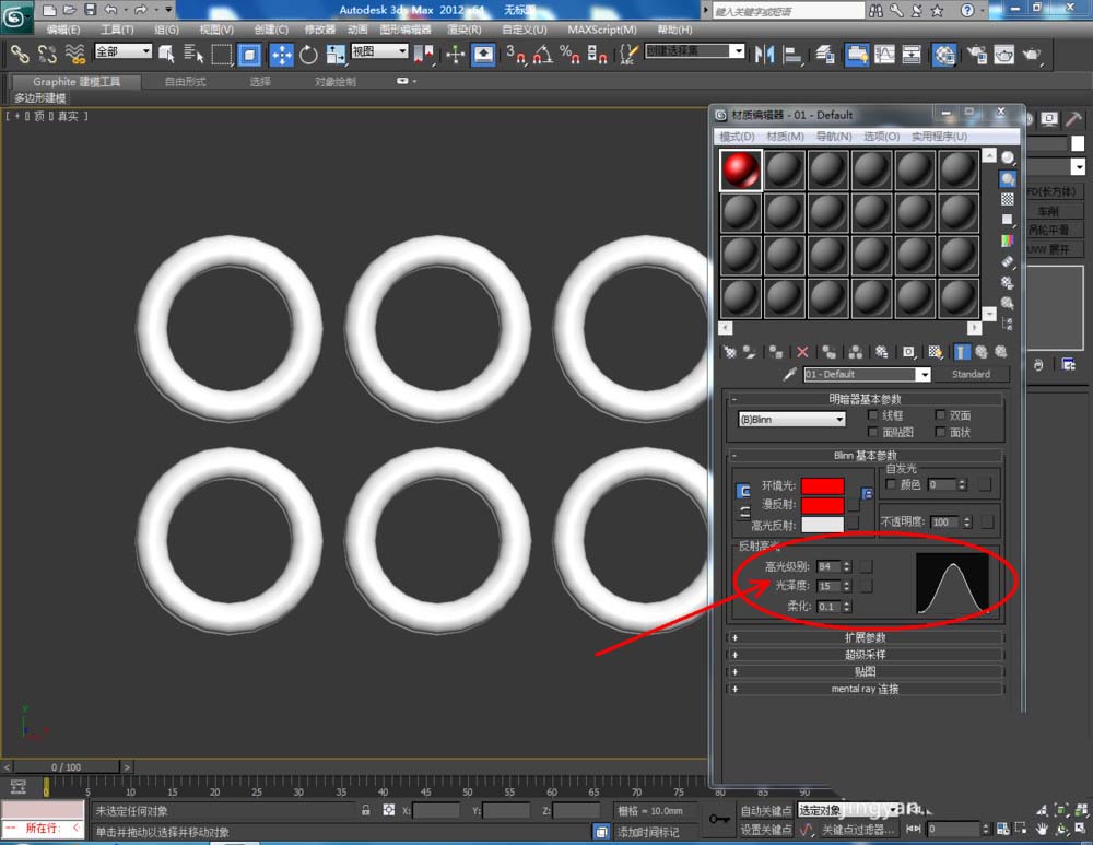 3、點擊【材質編輯器】,彈出材質編輯器設置框,按圖示設置一個紅色材質球,將材質球附加給第一個圓環模型。按照同樣的步驟,分別設置好另外幾個圓環的材質(如圖所示);