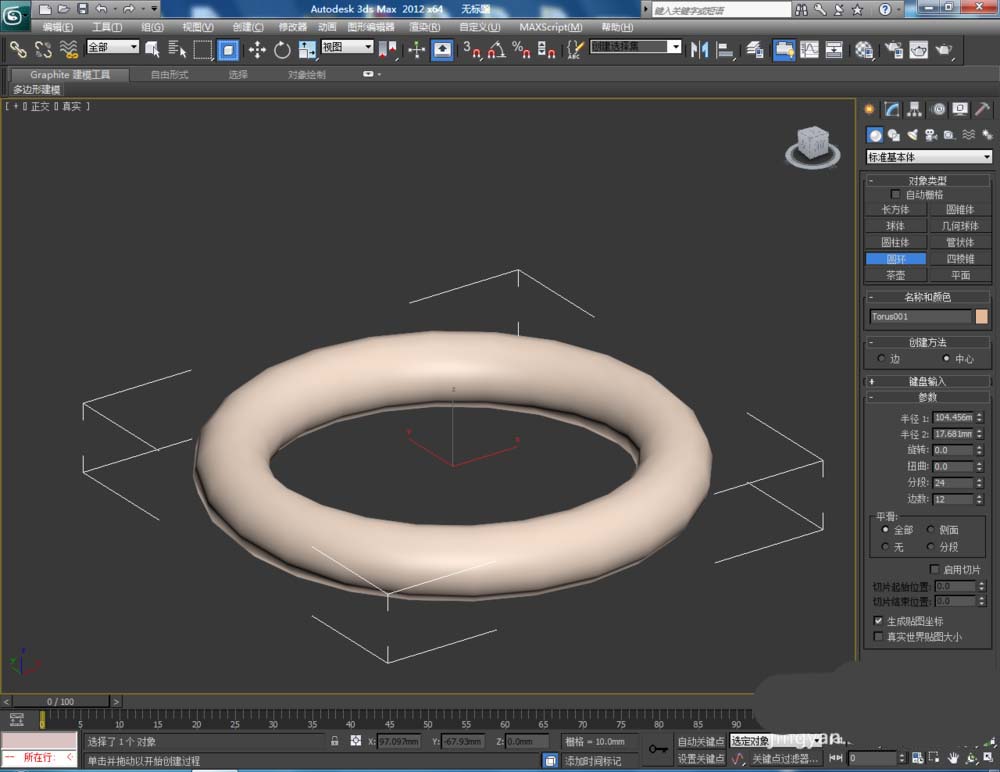 1、打開3Dmax2012軟件,點擊【創建】-【幾何體】-【圓環】,在作圖區域繪制一個圓環模型。完成后,對右邊工作區中圓環的參數進行設置(如圖所示);