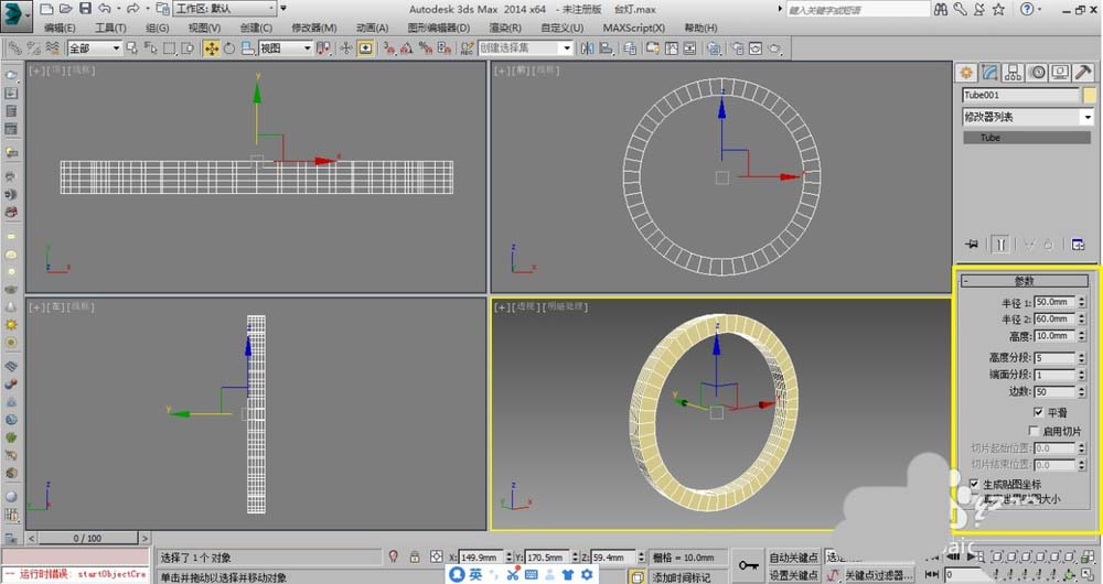 1、繪制鬧鐘的外形部分,創建一個管狀體,半徑1為50毫米,半徑2為60毫米,厚度為10毫米,其它具體參數如下圖所示。