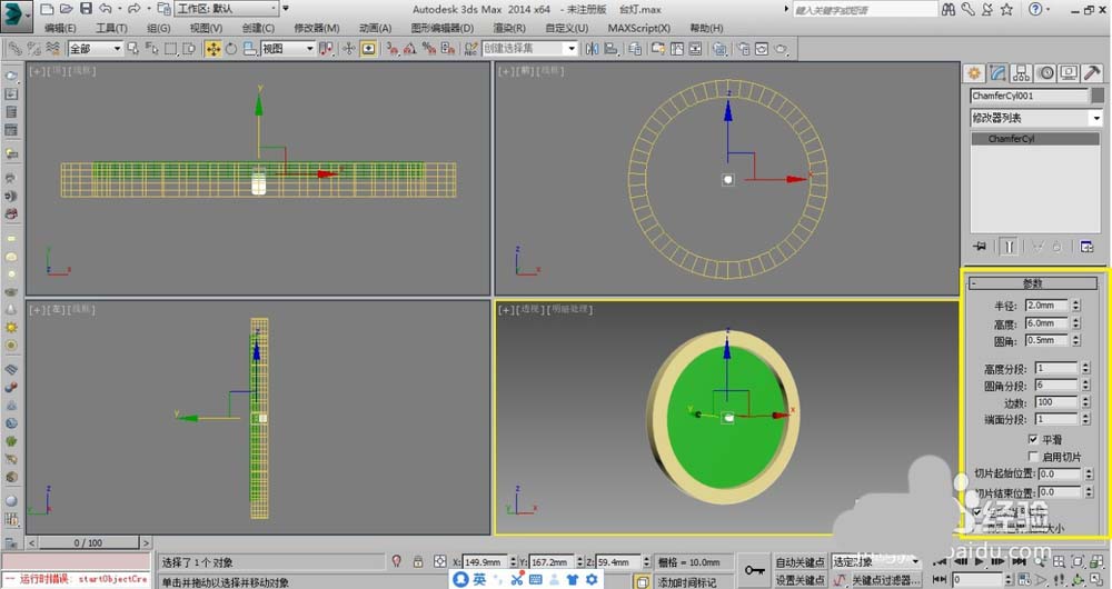 3、繼續繪制鬧鐘的鐘心位置,畫一個切角圓柱體與圓柱體的X軸和Z軸中心對齊,切角圓柱體的參數如下圖所示。