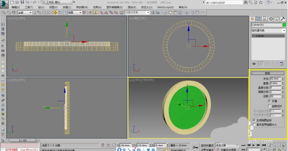 2、然后在管狀體的上面繪制一個圓柱體,具體參數如下圖,并把它們的X、Y、Z軸進行中心對齊。