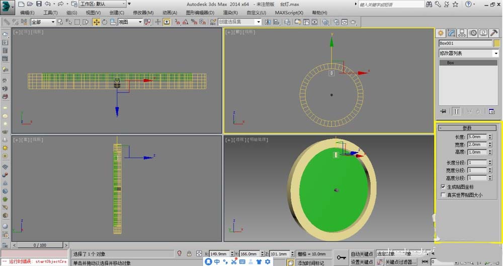4、接著繪制鬧鐘的點數,畫一個長方體,具體參數如下。把長方體與切角圓柱體在X軸和Z軸中心對齊,在前視圖把長方體在Y軸上移動到相應的位置,如下圖所示。