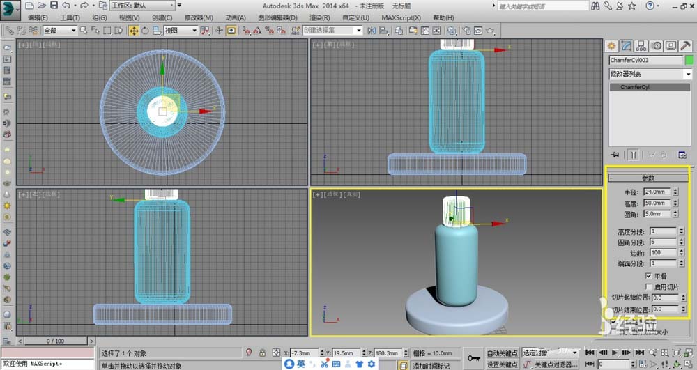 2、再在灰色切角圓柱體的表面上繪制一個小藍色的切角圓柱體,使他們中心對齊,參數如下圖所示。(這里用到了基本體對齊的知識點)