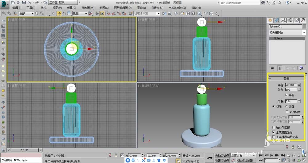4、在綠色切角圓柱體上面繪制一個圓球體作為燈泡,使圓球的最底部與圓柱體中心和表面都對齊,其參數如下面圖紙所示。