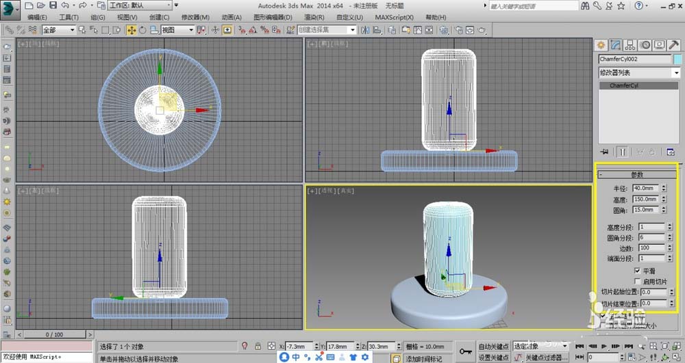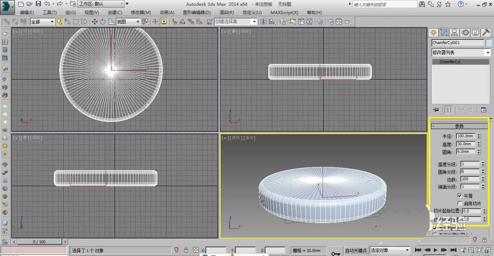 1、開始繪制臺燈的最低部分,畫一個灰色切角圓柱體,圓柱體的各參數如下面圖紙所示。(這里用到了基本體的創建和其參數的修改)
