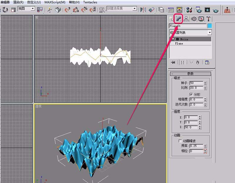 1、打開3ds max軟件,在視圖中創建一個已經應用了“噪波”變形器的平面。