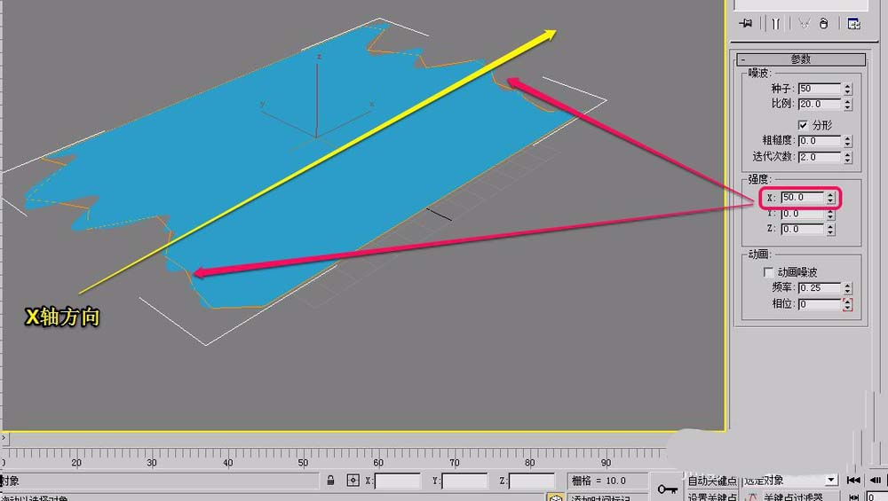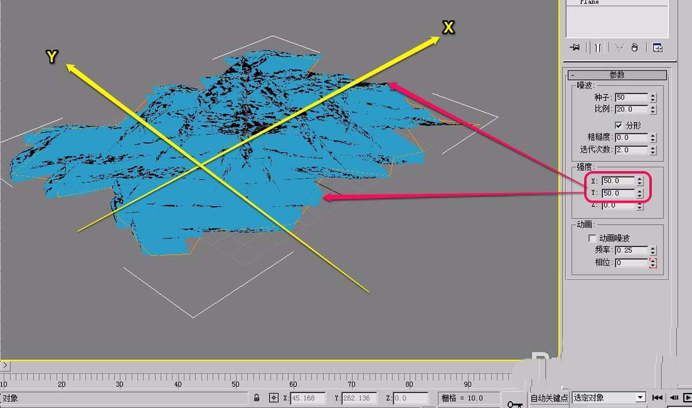 5、我們現在更改一下 “X”的數值。將值設置為 50.0 ,可以看到,平面沿著 X 軸方向進行了噪波的應用變化。同理,當只更改X、Y、Z其中一項數值時,平面也只是在一種方向上產生噪波變化。