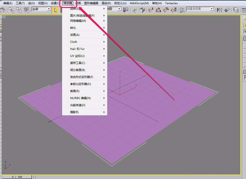2、選中平面,打開“修改器”菜單。