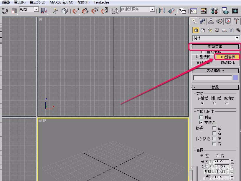 3、打開“對象類型”卷展欄,單擊“U型樓梯”按鈕。