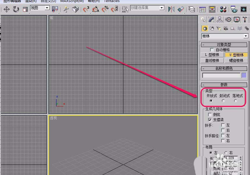 5、打開“參數”卷展欄,在“類型”中選擇一種樓梯類型,默認是“開放式”。