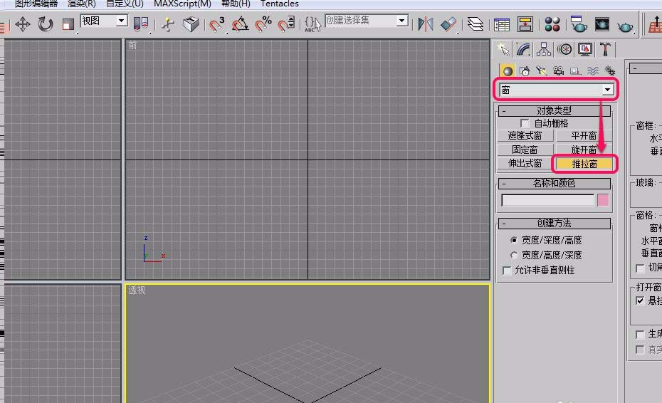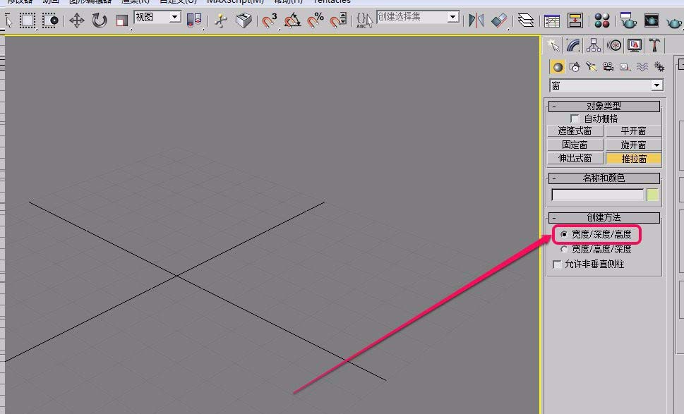5、打開“創建方法”卷展欄,我們選擇“寬度/深度/高度”選項,意思是將要按照寬度->深度->高度的順序進行推拉窗的創建。