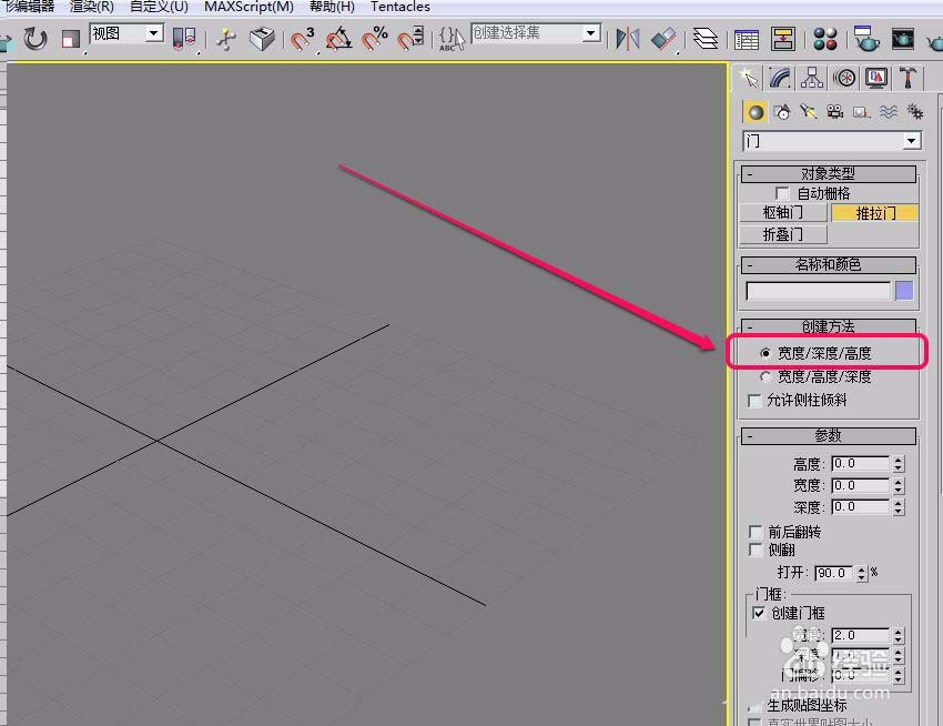5、打開“創建方法”卷展欄,選擇“寬度/深度/高度”選項。選擇這一選項的意思是,將要按照寬度->深度->高度的順序來創建推拉門。