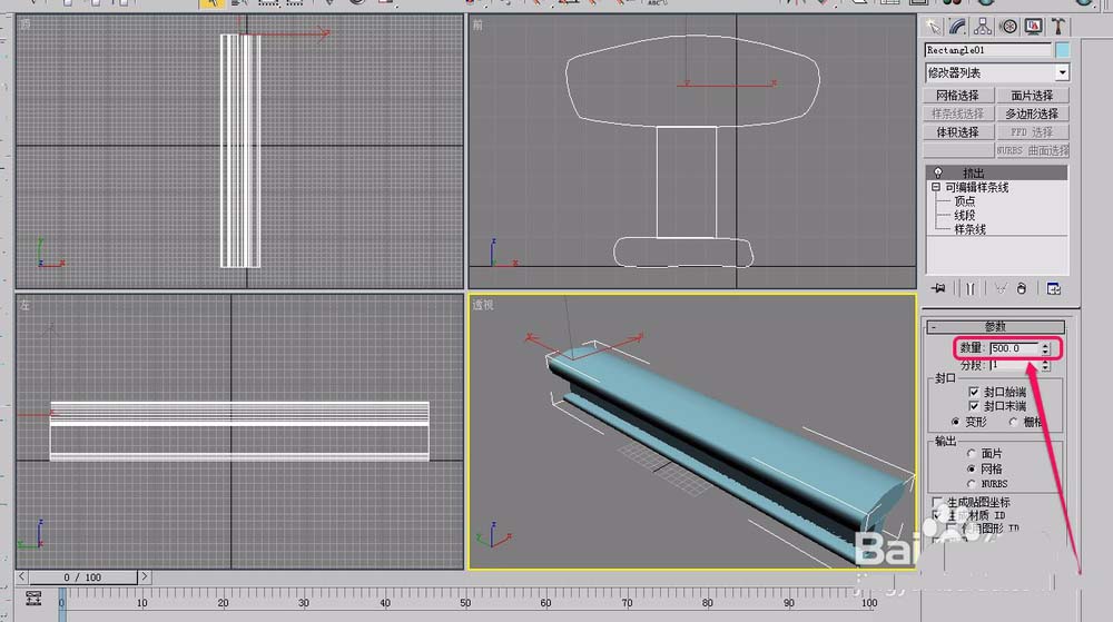 6、打開(kāi)“修改”選項(xiàng)卡中的“參數(shù)”卷展欄,將“數(shù)量”設(shè)置為 500.0 。可以看到,鐵軌明顯變長(zhǎng)了。
