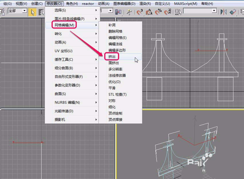 8、選擇“網格編輯”項中的“擠出”命令。