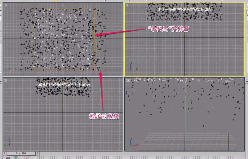 1、打開3ds max軟件,如圖所示,新建一個“暴風雪”發射器和一個“粒子云”系統。