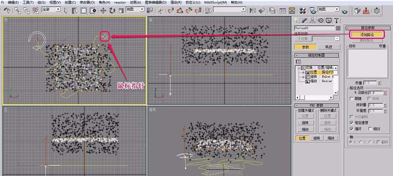 10、單擊“路徑參數”卷展欄中的“添加路徑”按鈕,將鼠標指針移動到曲線上面,當指針變成圖示的形狀時,單擊鼠標。