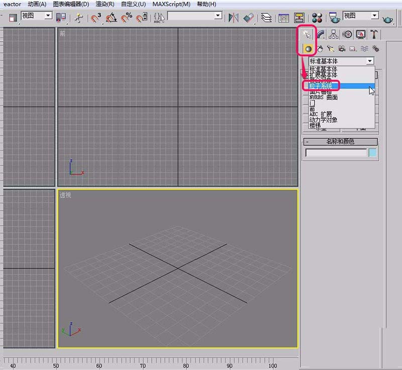 2、打開“創(chuàng)建”選項(xiàng)卡,選擇“幾何體”下拉菜單中的“粒子系統(tǒng)”命令。