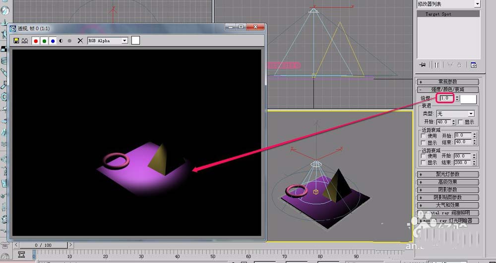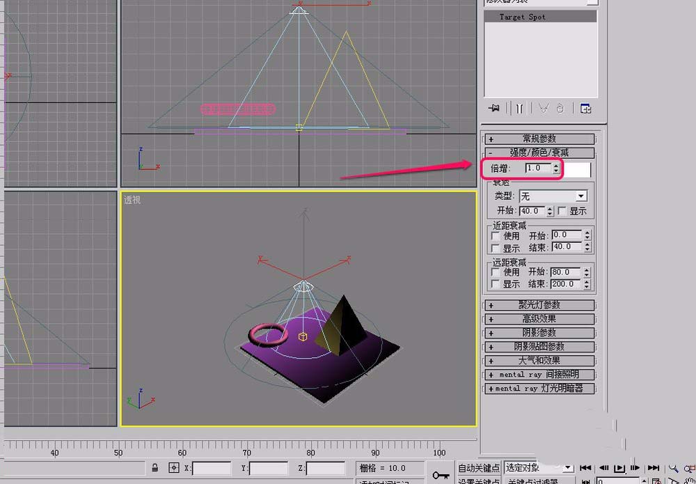 4、“倍增”,默認(rèn)是1.0 ,隨著數(shù)值的增減,聚光燈的照射強(qiáng)度也會(huì)跟著增減。