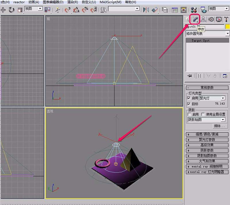 2、用鼠標(biāo)選中目標(biāo)聚光燈,打開“修改”選項(xiàng)卡。