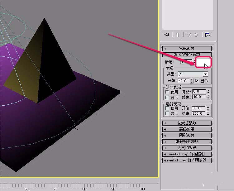 6、我們接著看如何改變燈光的的顏色。用鼠標(biāo)選擇“倍增”項(xiàng)右側(cè)的白色按鈕。