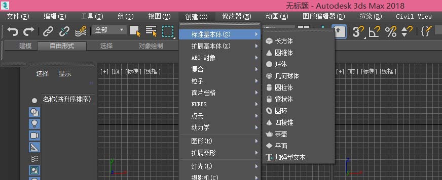 3、從最上面的操作欄中來找到創(chuàng)建選項,打開創(chuàng)建選項我們就可以看到標(biāo)準基本體,我們要介紹的圖形就在標(biāo)準基本體中,如圖