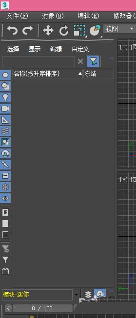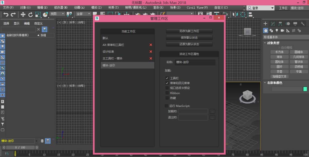 5、再來把工作區修改為模塊迷你,我們就可以看到3ds Max的操作界面又發生了變化,功能又更改了,如圖
