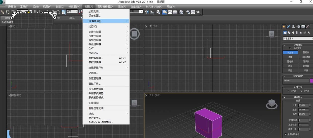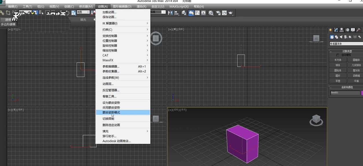 3、在菜單欄中選擇動畫,選擇蒙皮姿勢模式即可。