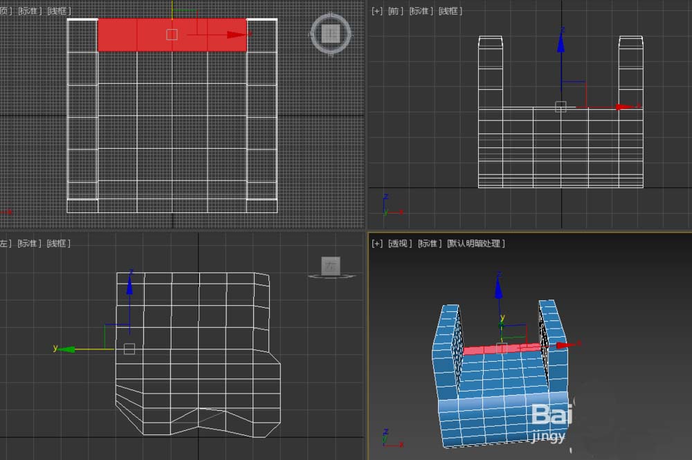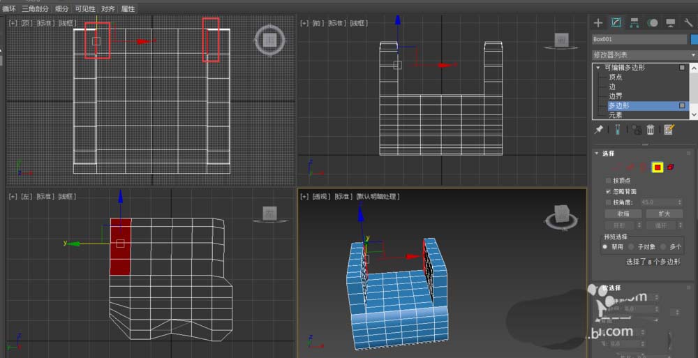 7、進入多邊形層級,選擇如圖所示的多邊形,按鍵盤中的delete鍵,將選擇的多邊形刪除。
