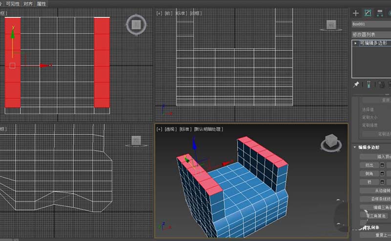 4、進入多邊形次物體級,在頂視圖選擇多邊形,拉出兩側的扶手造型。拉伸高度為80