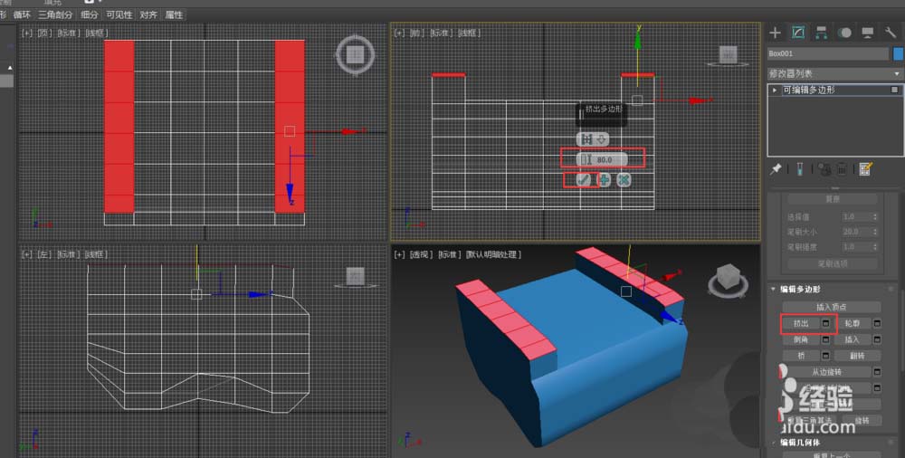 1、在透視圖中選擇如圖的多邊形,并單擊擠出后的按鈕,選擇拉伸高度為80,應用,并再拉伸兩次。