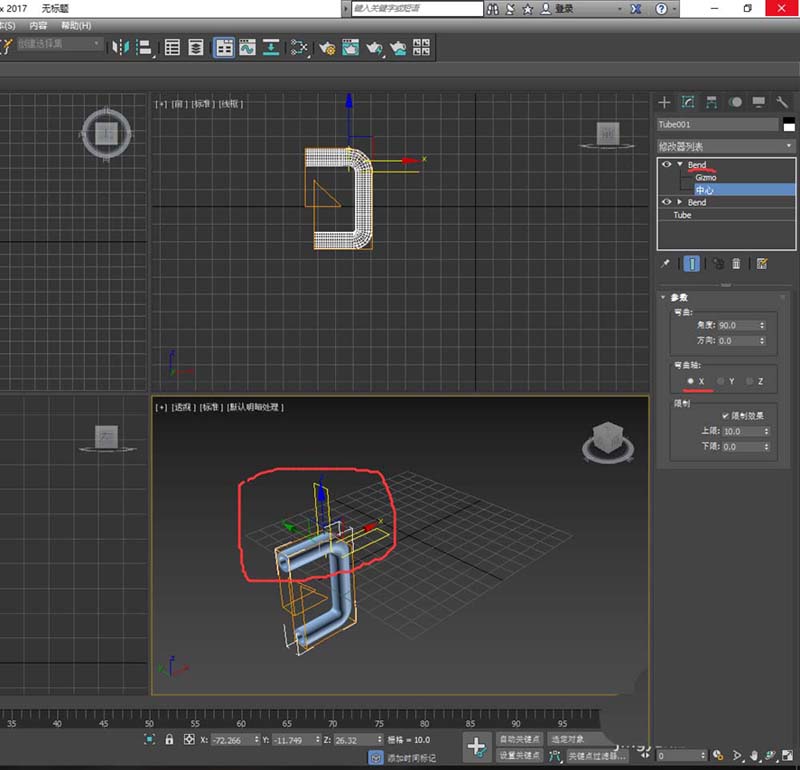 4、彎曲角度為90度,彎曲軸為z軸,勾選限制效果,上限為10(角度和上限可根據需求隨意變化)