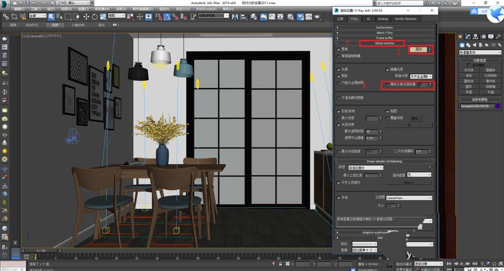 2、打開打開V-Ray,打開全局開關(guān)(Global switches),“基本”模式切換至“高級”模式,把“隨機(jī)是計算光源數(shù)量”前面的“√”去掉不選;