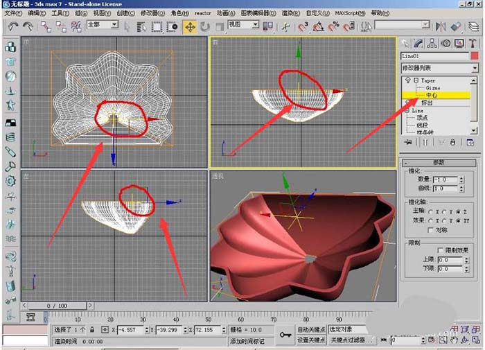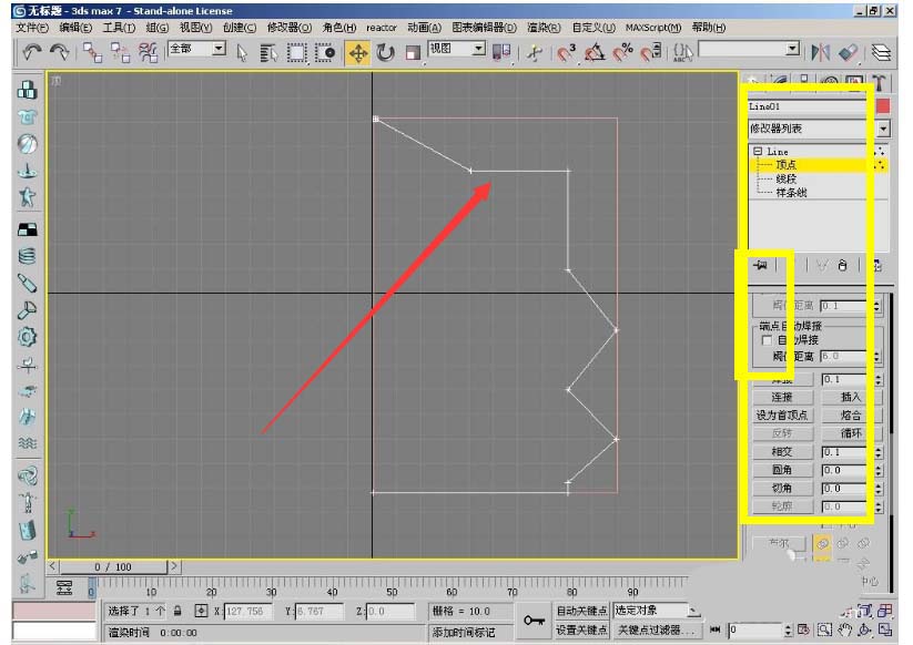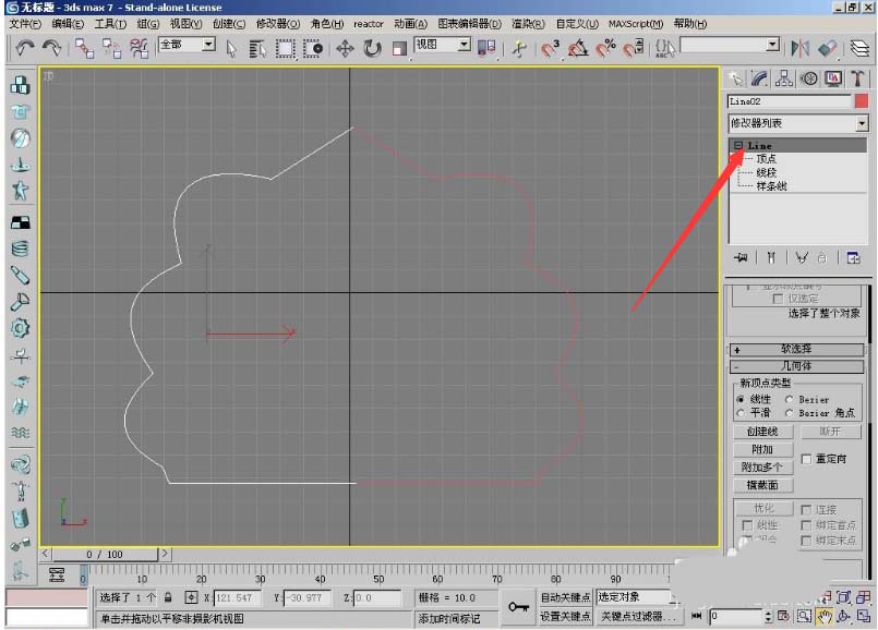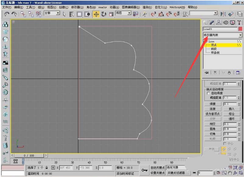 2、在修改器列表中單擊頂點,創建線形,并修改線形為圓弧狀。